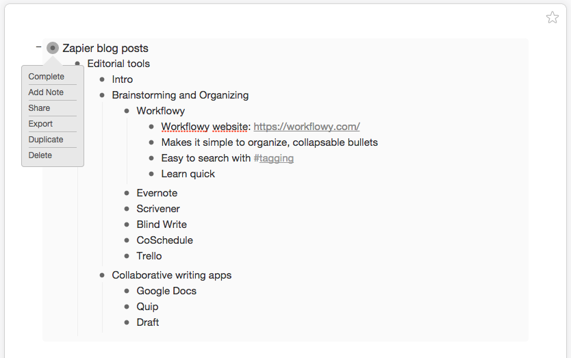 Хорошо структурированное письмо начинается с хорошо структурированного конспекта. WorkFlowy делает составление конспекта простым: приложение позволяет быстро создать организованное резюме любого письменного проекта и всех его частей с помощью маркированных пунктов и вложенных списков. Начните с общих штрихов – названий разделов, основных идей, тем – и вложите связанные с ними детали и исследования под этими пунктами. WorkFlowy также предлагает функции тегирования и поиска на основе хэштегов, поэтому вам не придется беспокоиться о создании слишком большого количества списков или о том, чтобы пустить на самотек все пункты. Вы можете увеличить масштаб любого списка, нажав на соответствующий пункт. Кроме того, если вы наведете курсор на пунктирную точку, вы увидите опции завершения, добавления примечания, совместного использования, экспорта, дублирования или удаления этого элемента. Используйте опцию “Завершить”, чтобы отмечать разделы конспекта по мере их написания, или перетаскивайте маркированные списки для организации конспекта в логические разделы. Стоимость WorkFlowy: Бесплатно – до 250 элементов списка в месяц; от $4,99 в месяц за план WorkFlowy Pro, который включает неограниченное количество списков и элементов, а также возможности настройки.