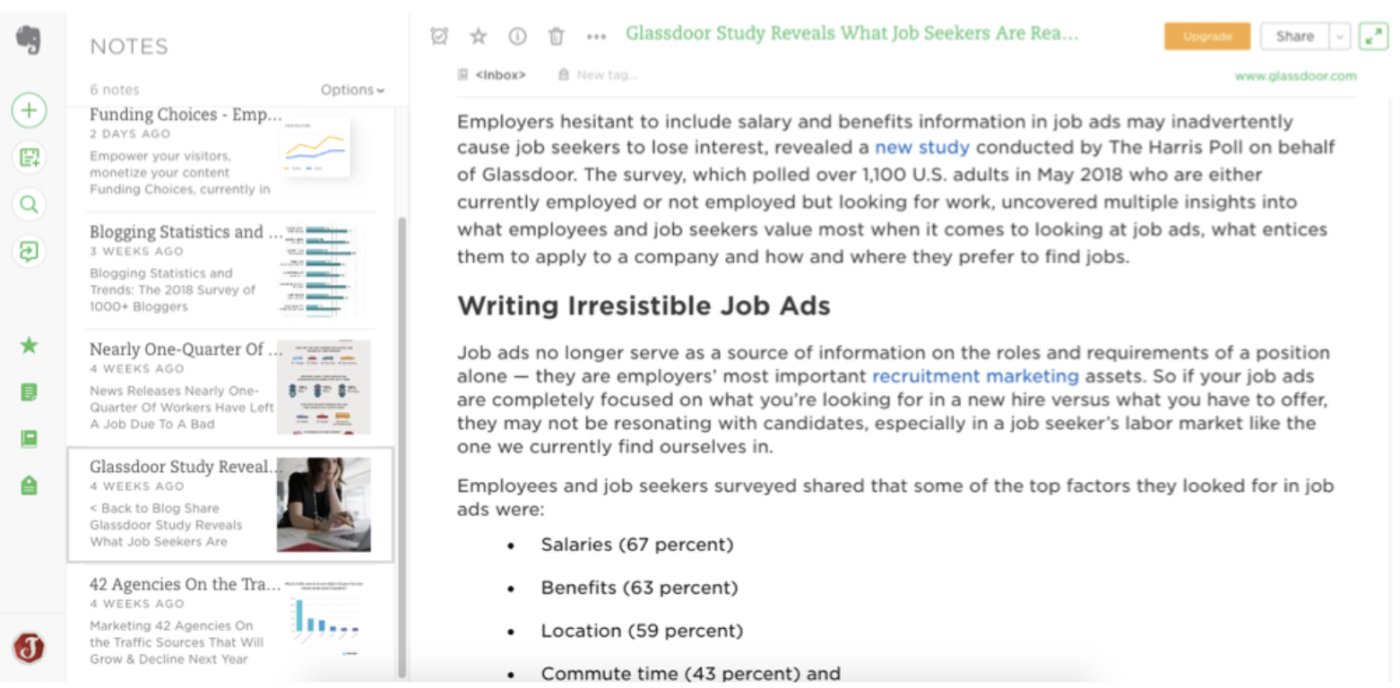 Вы можете составлять заметки для своего контента, делая скриншоты исследований, которые вы хотите включить, и вставляя их в Google Doc, делая рукописные заметки в блокноте или создавая собственный список закладок. Но все эти варианты отнимают много времени и затрудняют поиск. Evernote предлагает более простой вариант. Используя веб-клиппер Evernote, вы можете захватывать полные тексты статей в Интернете в пару кликов. Затем статьи добавляются в Evernote, где вы можете организовать собранные исследования в различных блокнотах, читать полные тексты сохраненных статей, искать все собранные исследования одновременно и делиться собранными исследованиями с другими. Кроме того, вы можете автоматизировать ведение заметок с помощью интеграции Evernote с Zapier. С премиум-планом Evernote вы можете использовать его мобильное приложение для сканирования рукописных заметок, страниц книг и визитных карточек. Отсканированные документы также доступны для поиска, что позволяет легко найти то, что вы ищете, независимо от формата. Это делает его отличным местом для хранения документов, которые могут понадобиться вам в будущем. Цены на Evernote: Бесплатно за ежемесячную загрузку до 60 МБ, максимальный размер заметки 25 МБ и приложения Evernote на двух устройствах; от $7,99 в месяц за мобильное приложение-сканер, PDF-файлы с возможностью поиска, более высокие ограничения на загрузку и размер заметки, а также приложения Evernote на неограниченных устройствах.
