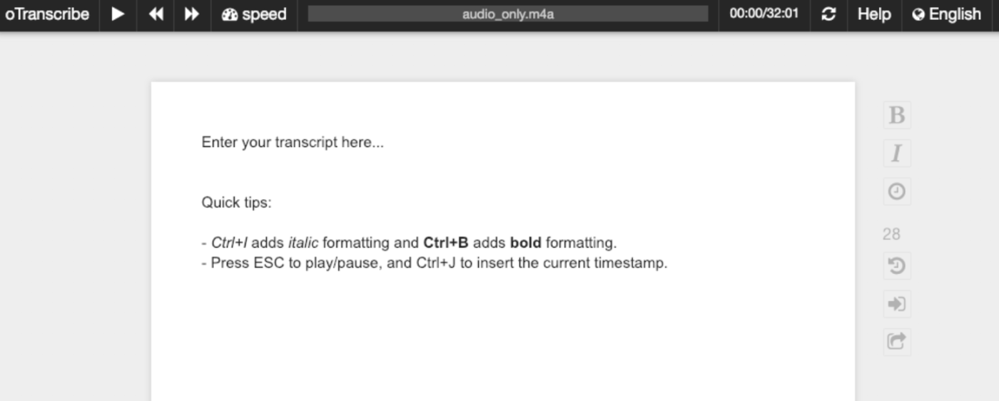 . Другие элементы управления позволяют перескакивать вперед или назад на несколько секунд или регулировать скорость воспроизведения аудио. Если вы планируете опубликовать свою стенограмму, вы можете добавить базовое форматирование, например, жирный шрифт или курсив, а также использовать Control