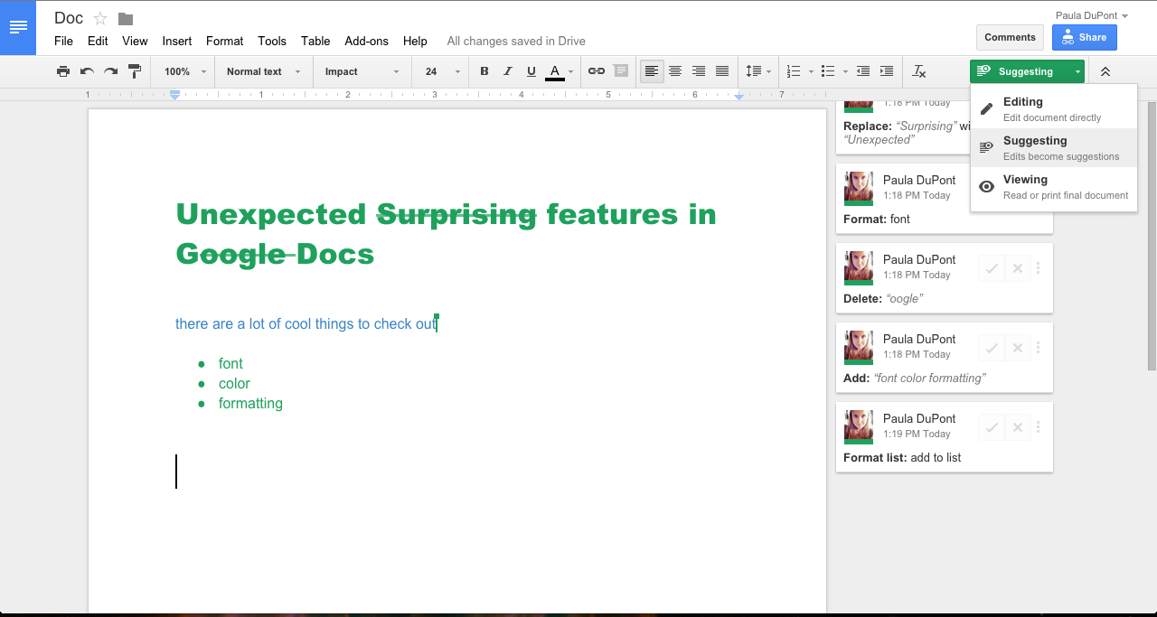 Имея бесплатный аккаунт Google, вы можете использовать Google Docs для написания, редактирования и архивирования своих работ. Он автоматически сохраняет документ на Google Диске почти после каждого набранного слова, гарантируя, что вы никогда не потеряете часть своего черновика, и автоматически создает резервные копии всего написанного в облаке. Кроме того, вы можете автоматизировать создание документов с помощью интеграции Zapier в Google Docs. И хотя все это делает Google Диск отличным инструментом для любого типа письменных работ, его особенность заключается в возможностях совместной работы. Несколькими щелчками мыши вы можете поделиться своим документом с другими пользователями и предоставить им права на просмотр, редактирование или комментирование. И что самое приятное, все, с кем вы поделились файлом, могут редактировать документ одновременно, не отменяя чужих изменений. Подобно инструменту отслеживания изменений в Word, режим “Предложения” в Документах Google позволяет участникам совместной работы рекомендовать изменения, которые каждый может либо отклонить, либо принять. Если вы принимаете предложение, Документ автоматически включает его, так что вам не придется вводить его самостоятельно. В Docs также ведется история версий каждого созданного документа, поэтому можно легко получить доступ к предыдущим версиям или узнать, кто внес конкретные изменения. Цены на Google Docs: Бесплатно