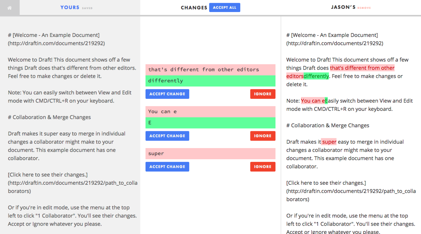 Хотя Google Docs имеет отличные возможности совместного редактирования, он не предлагает такого же страхования редактирования, как Draft. В Draft редактирование осуществляется таким образом, что изменения, вносимые сотрудником, не должны немедленно изменять исходный документ. Вместо этого для каждого раунда редактирования создается новая версия. После того как кто-то вносит правки, владелец документа должен индивидуально принять или отклонить их. Каждый раз, когда это делается, автоматически создается новая версия документа, и владельцу документа предоставляется возможность переключаться между этими версиями. Это работает подобно функции “Предложения” в Google Docs, но гарантирует, что исходный документ всегда будет легко доступен. После завершения написания черновика вы можете поделиться им с другими пользователями с помощью ссылки, загрузить содержимое в формате Markdown, обычного текста или HTML или отправить его себе по электронной почте в виде файла PDF, Google Doc или Word. Цены на Draft: Бесплатно