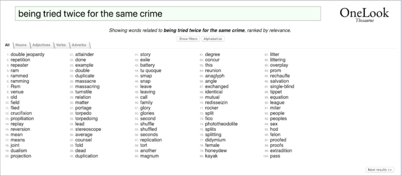 Обратный словарь и тезаурус OneLook работает как любой другой тезаурус, которым вы пользовались: Введите слово, и он предложит десятки синонимов, которые можно рассмотреть в качестве альтернативы. И хотя тезаурус является обязательным атрибутом любого писателя, OneLook предлагает некоторые уникальные возможности. Например, в OneLook можно вводить не только одно слово: Введите фразу или даже целое предложение. Скажем, вы не можете придумать слово, которое хотите использовать и которое означает “трудно запомнить”. Введите фразу в OneLook, и он выдаст несколько вариантов, таких как “неуловимый”, “туманный” и “мнемонический”. Вы даже можете отфильтровать результаты по частям речи, чтобы увидеть только существительные, прилагательные, наречия или глаголы. Цена обратного словаря: Бесплатно