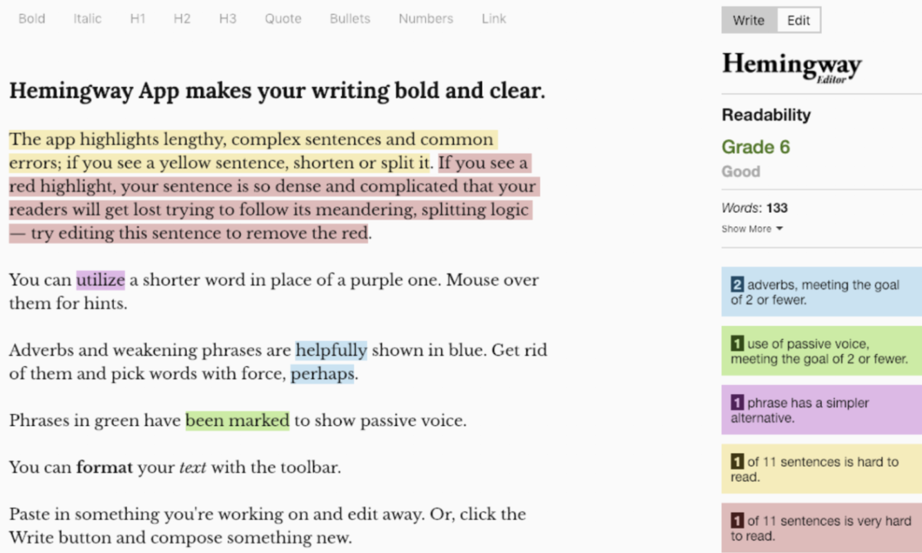 Эрнеста Хемингуэя хвалили за консервативное использование слов и умение передать объем в коротких предложениях. Редактор Хемингуэя поможет вам сделать то же самое, что и он, что делает его полезным для очистки всех тех мыслей, которые вы выплеснули на страницу. Вставьте свой контент в Hemingway, и он выделит проблемные места в нескольких категориях: использование наречий, использование пассивного залога, слишком сложные слова и фразы, а также слишком сложные предложения. Прокрутите свой материал, чтобы найти выделенные пункты, а затем внесите необходимые изменения, чтобы убрать наречия, использовать активные глаголы и упростить сложные предложения. Хемингуэй также присваивает вашему письму оценку, которая отражает уровень чтения вашего материала. Чем ниже оценка, тем более доступным будет ваше содержание для широкой аудитории. В долгосрочной перспективе Хемингуэй учит вас быть лучшим писателем, потому что вы выявляете и исправляете свои ошибки. Со временем вы перестанете делать их так много, и в конце концов вы можете обнаружить, что этот инструмент вам больше не нужен. Цены на Hemingway Editor: Бесплатно для редактирования в веб-приложении Hemingway; $19,99 для настольного приложения для Mac или Windows.
