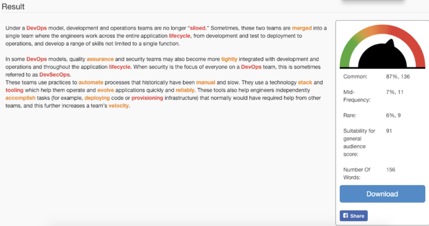 Допустим, вы разработчик, пишущий статью в блоге для других разработчиков. Возможно, это нормально и ожидаемо – использовать специфические для отрасли слова (жаргон), которые вы используете каждый день в своей роли. Однако если вы разработчик, пишущий пояснения для тех, кто не является разработчиком, использование повседневного технического жаргона может озадачить и оттолкнуть вашу аудиторию. Но трудно распознать жаргон, когда термины, которые вы используете в своей роли, укоренились в вашей повседневной манере общения. Именно здесь на помощь приходит программа De-Jargonizer: Он поможет вам определить слова, которые могут показаться жаргонными читателям, не работающим в вашей сфере. Вставьте свой текст в De-Jargonizer или загрузите в него черновик, и он выделит потенциально проблемные слова оранжевым или красным цветом, в зависимости от степени тяжести. Хотя иногда он выделяет слова, которые на самом деле не являются жаргонными (например, “эволюционировать” в приведенном выше примере), он отлично справляется с задачей выделения слов, которые вам, возможно, нужно изменить или определить для аудитории новичков (например, “жизненный цикл”, “обеспечение” и “скорость”). Стоимость De-Jargonizer: Бесплатно