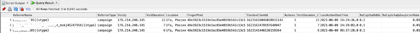 Что тут видно? На сайт клиента было сделано 3 захода (визита) с одного IP- адреса (вот этот адрес 178.214.248.145) в один день (8 июня 2021 года). При этом каждый визит пользователя содержал одно действие (Actions) и длительность первых двух была порядка 6 секунд, третий 22 секунды. Источник определялся как город Уфа, оператор связи https://www.ufanet.ru/.