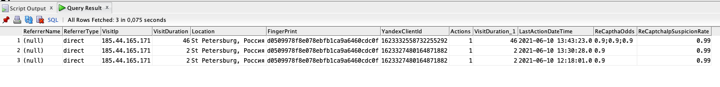 Что мы делаем еще? Мы проверяем визит с помощью Google reCaptcha, чтобы получить дополнительную оценку качества сессии. Если мы вернемся на изображения выше, то увидим, что для всех визитов ботов коэффициент reCapcha был равен 0.1 (очень высоко вероятно это бот в терминологии Google), а визит нашего сотрудника при проверке расчета Яндекс.ClientID дал коэффициент 0.9 (очень высоко вероятно это человек). Следом у нас работает алгоритм машинного обучения (если быть конкретнее, алгорим К-ближайшее), который кластеризует все визиты, чтобы находить тех ботов, который стараются мимикрировать под обычных пользователей (для описания этого алгоритмы мы подготовим отдельную статью).