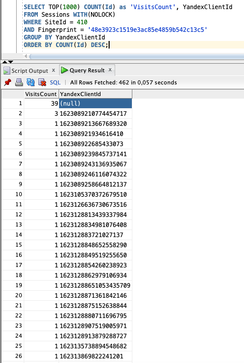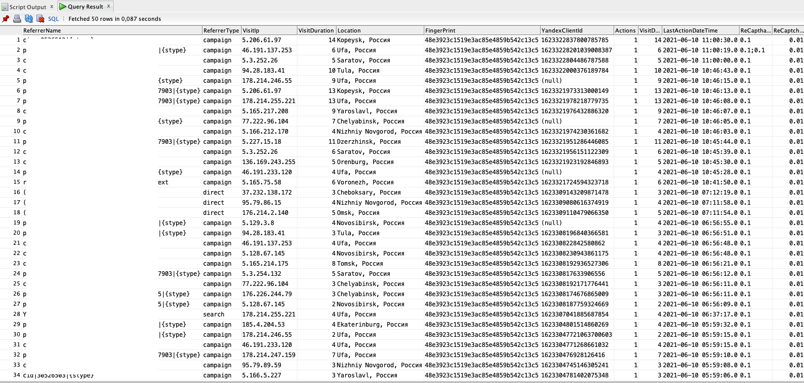 Итак, начали? Давайте сразу посмотрим на изображение ниже (можно увеличить по клику). Это фрагмент из нашей внутренней базы данных, где фиксируются в режиме онлайн все визиты пользователей на сайты клиентов.