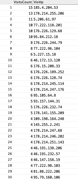 Как часто этот пользователь менял IP- адреса при кликах на рекламу сайта? Мы сделали простую выборку, см. изображение ниже. Видно, что каждый IP- адрес использовался несколько раз и легко обратить, что некоторые адреса явно брались с одного пула (например 176.222.*.* или 176.214.*.*).