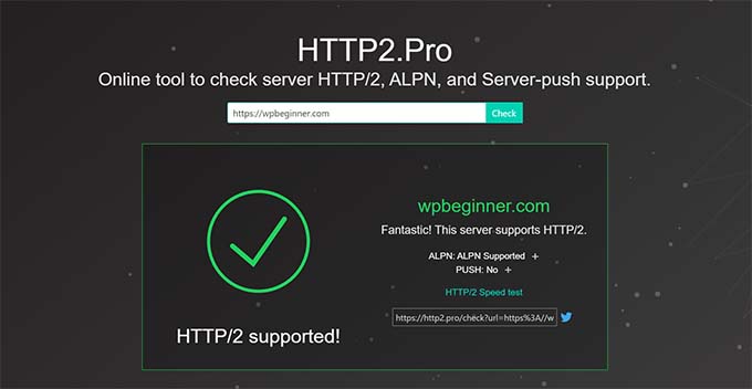 Если вы хотите проверить, обслуживает ли ваш сайт WordPress страницы по протоколу HTTP/2, то это можно сделать двумя способами. Во-первых, можно посетить сайт HTTP2.Pro и ввести URL-адрес своего сайта. Этот бесплатный онлайн-инструмент покажет, поддерживает ли ваш сайт протокол HTTP/2.
