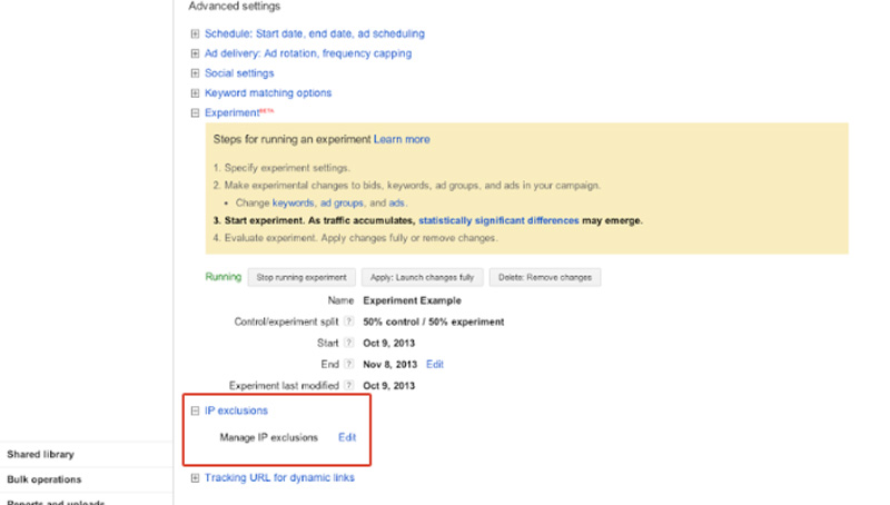 В настройках кампании перейдите к дополнительным настройкам и нажмите кнопку со списком исключенных IP-адресов. Нажмите «Изменить», чтобы начать ввод IP-адресов.