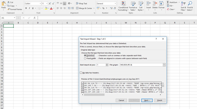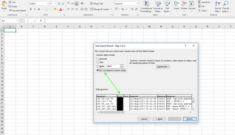 Этот экран позволяет выбрать, как Excel будет импортировать данные. Вы должны убедиться, что вы выбрали разделителем пробел, поскольку именно так форматируются стандартные логи. Excel покажет предварительный просмотр для данных, которые будут импортированы. Данные должны быть разбиты на отдельные столбцы, как показано на рисунке выше.