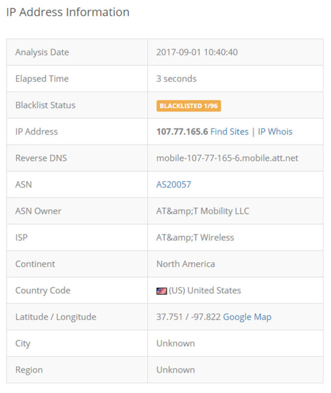 После проверки IP-адреса по черным спискам, результаты показывают некоторую интересную информацию. Как вы можете видеть, IP-адрес фактически занесен в 1 черный список из 96. Не так много, но обычно пользователю надо быть спамеров или мошенником, чтобы попасть даже в один из этих списков. Более важно то, что фактически этот IP-адрес используется мобильным оператором AT&T. Это означает, что за ним может стоять не один пользователь, а тысячи или даже миллионы.