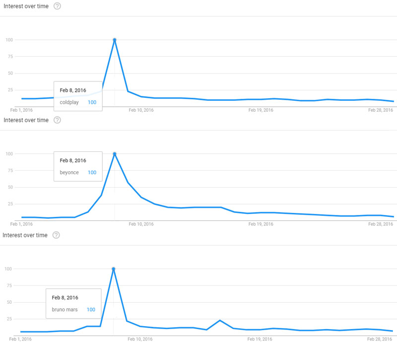 Есть также много ключевых слов, которые могут получать всплески в количестве поисковых запросов из-за определенных событий. Отличным примером этого является Superbowl 50 в 2016 году, когда Coldplay, Beyoncé и Bruno Mars выступили в перерыве шоу — все бросились искать их записи, что привело к росту продаж альбомов.