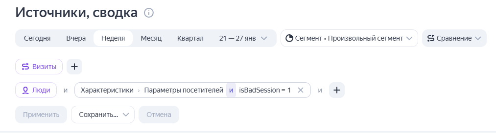 В вашей Яндекс. Метрика перейдите в раздел Отчеты / Популярное / Источники, сводка. Создайте новый отчет и в нем укажите имя параметра обязательно isBadSession. Процесс создание СЕГМЕНТА в Яндекс.Метрика отражен в следующих изображениях: