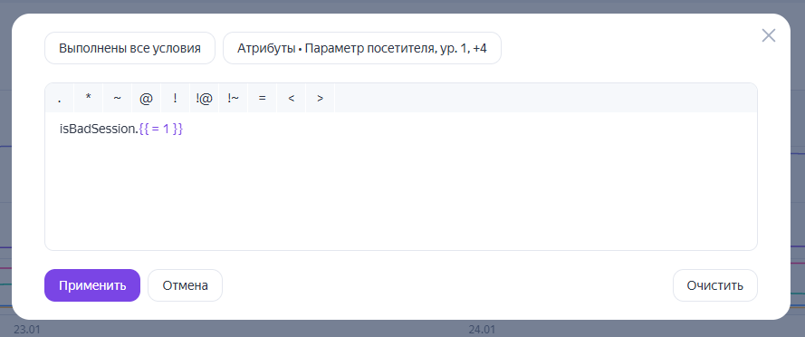 Значение isBadSession в открывшемся отчете необходимо прописать самостоятельно. Необходимо выбрать в отчете : “Люди” + “Характеристики” – “Параметры посетителей” , далее в открывшемся окне указать isBadSession.{{ = 1 }}, выбрать вариант “Выполнены все условия” и нажать “Применить”. Должно получиться, как в примере ниже: