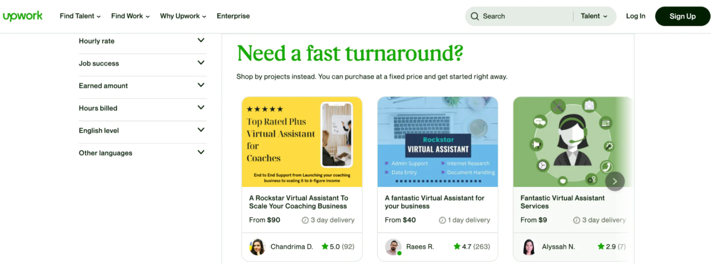 Рынки фриланса являются хорошей отправной точкой для поиска специализированного виртуального помощника, если у вас есть конкретные потребности и вы не против потратить дополнительное время на его подготовку. Upwork, Guru и Fiverr – популярные биржи фриланса для найма виртуального помощника, и если вы идете по этому пути, вы можете определить приоритеты вашей отрасли или указать основные навыки в процессе поиска. Многие рынки фриланса включают: