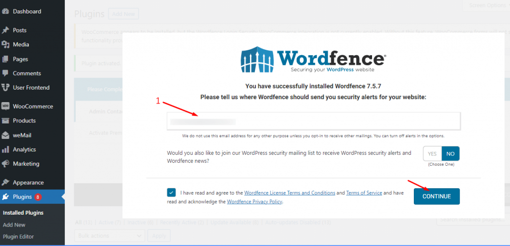 Выберите Wordfence Security- Firewall & Malware Scan и нажмите на кнопку Install Now. Активируйте плагин после успешной установки. Wordfence покажет вам приветственную страницу, где вам нужно указать свой адрес электронной почты (1) и нажать кнопку продолжить для успешной установки плагина.