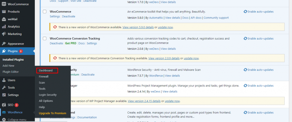 Шаг 2: Настройте параметры. Теперь у вас появится новое меню под названием Wordfence на левой панели администратора вашего сайта. Нажмите на меню Dashboard.