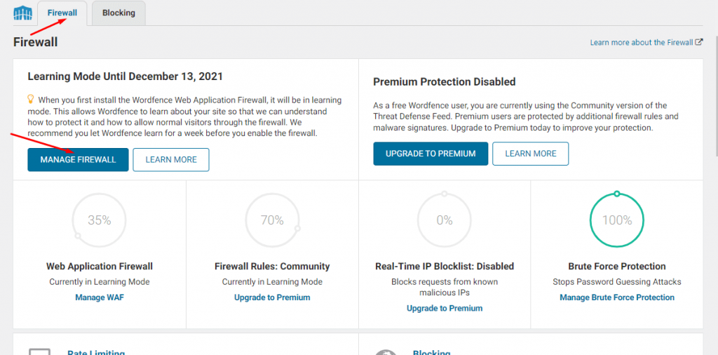 Шаг 3: Изучите опцию “Брандмауэр”. Нажмите на опцию Firewall в боковой панели прямо под меню Wordfence. Это приведет вас на следующую страницу. Нажмите на кнопку Управление брандмауэром.