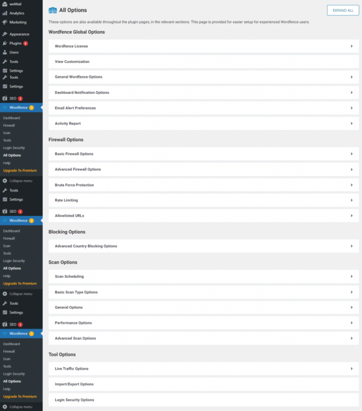 Шаг 5: Изучите меню “Все параметры”. Wordfence Security имеет меню All Options, в котором собраны все параметры настройки. Вы можете зайти на эту страницу, чтобы облегчить процесс настройки Wordfence.