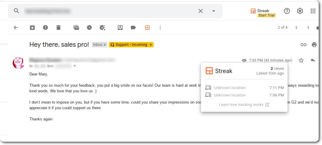 Streak позволяет пользователю узнать, в какое время и на каком устройстве получатель открыл и прочитал письмо.
