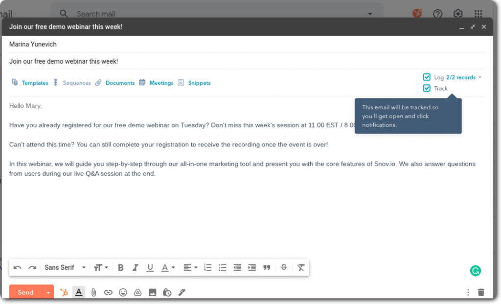 Расширение HubSpot Sales Chrome создано для того, чтобы помочь пользователям отслеживать, как их контакты взаимодействуют с их электронными письмами. Загрузив инструмент отслеживания, начните отправлять первое электронное письмо. Все, что вам нужно сделать, это написать свое сообщение, установить флажки “Журнал” и “Отслеживать”, а затем нажать кнопку “Отправить”.