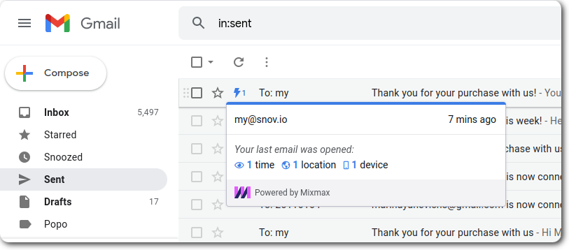С помощью этого расширения вы также можете активировать уведомления на рабочем столе для писем, которые вы хотите отслеживать. Когда получатель открывает ваше письмо, на экране компьютера появляется всплывающее окно, или вы можете просмотреть информацию, наведя курсор на значок молнии.