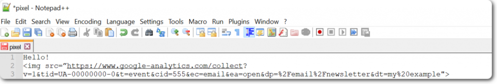 <img src=“https://www.google-analytics.com/collect?v=1&tid=UA-00000000-0&t=event&cid=555&ec=email&ea=open&dp=%2Femail%2Fnewsletter&dt=my%20example”>