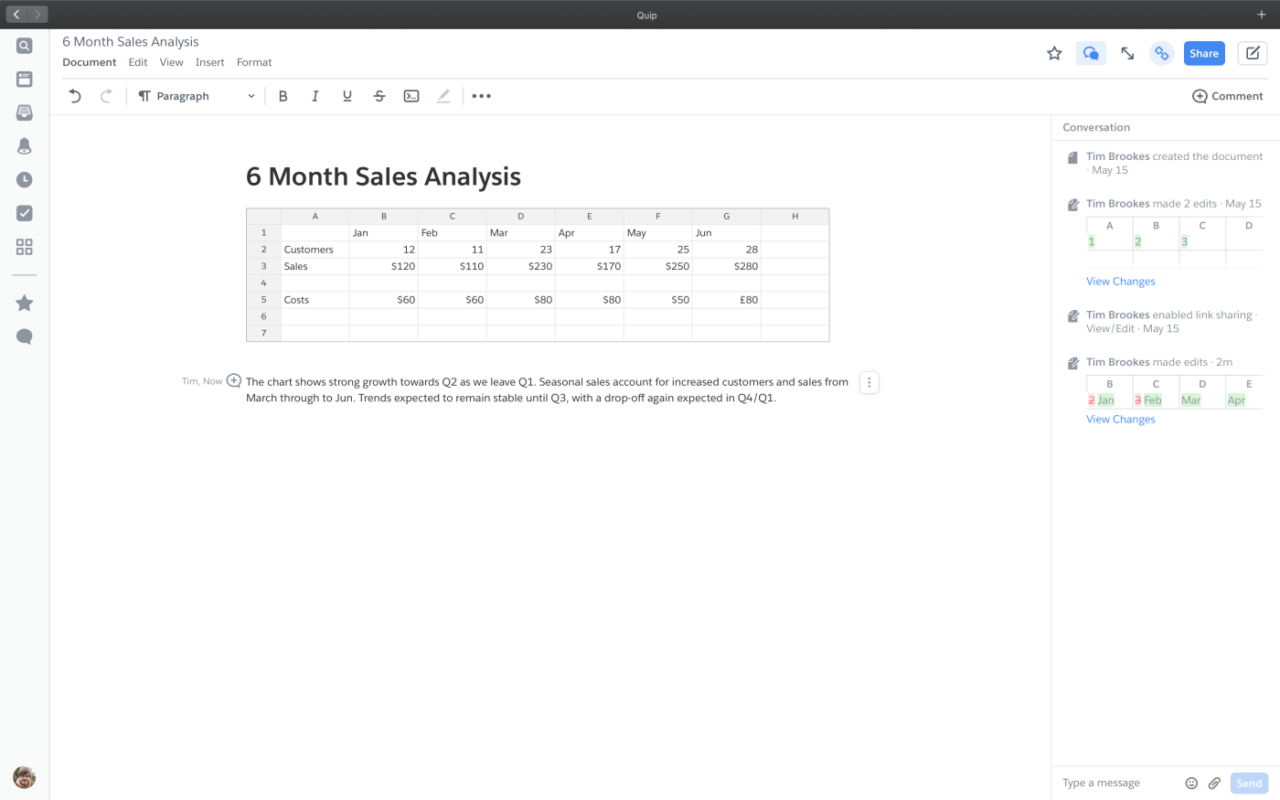 В каждом документе, над которым вы работаете, есть боковая панель чата – нажмите на “Показать беседу” в верхней части экрана, чтобы получить к ней доступ. Когда вы помечаете кого-то @mention, он получит уведомление. Совместное использование работает так же, как и в Google Диске: нажмите кнопку Поделиться, затем выберите Добавить людей или Получить ссылку. Это более сложная кривая обучения, чем Google Sheets, но подход схож. Помимо функций совместной работы, Quip выделяется возможностью интеграции электронных таблиц в другие документы Quip. Введите @