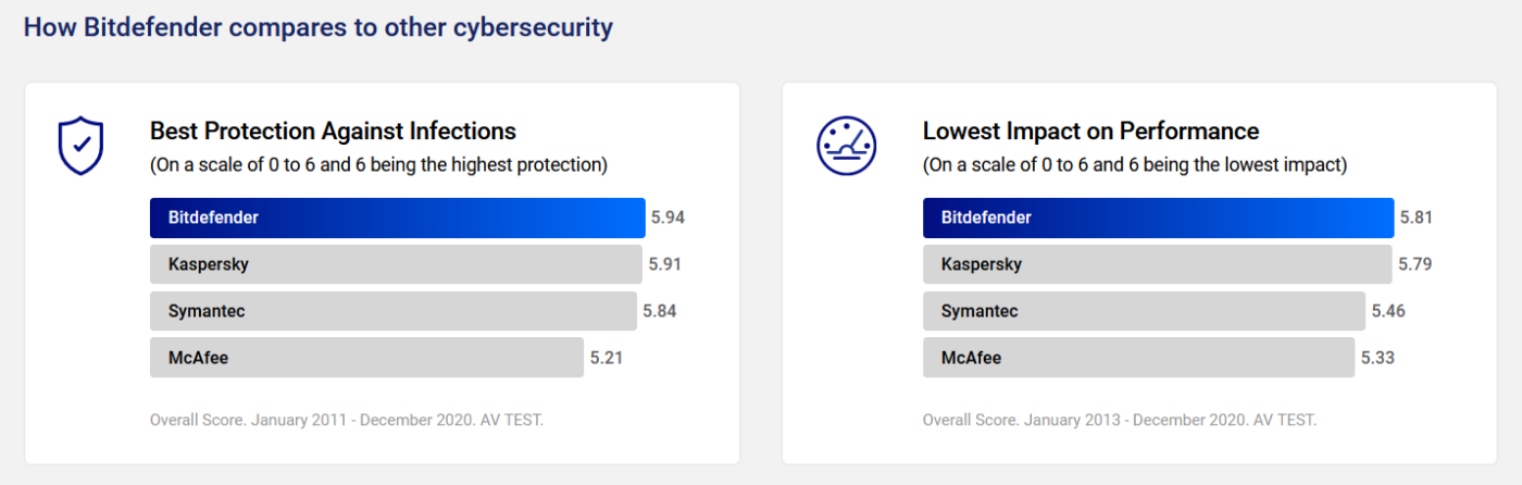 Bitdefender Total Security лучше всего подходит для обычных пользователей. Как и я, многие независимые исследователи безопасности также высоко оценили эту антивирусную программу за ее полную защиту от новейших интернет-угроз. Если вы хотите иметь полную защиту от вредоносных программ и хакеров, Bitdefender Total Security предлагает планы для 10 устройств. Вы можете защитить свои устройства Windows, Mac, iOS и Android с помощью одного плана. Bitdefender хорошо известен своим минимальным влиянием на производительность благодаря фирменной технологии Bitdefender Photon.