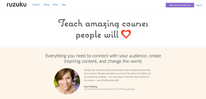 Лучшее для: Это одна из лучших платформ онлайн-обучения для тех, кто хочет установить более глубокую связь со своими учениками. На платформе Ruzuku поддерживаются различные виды медиа, и вы можете проводить вебинары так, как вам нравится. Ruzuku также хорошо подходит для доставки капельного контента в соответствии с различными временными графиками. Для того чтобы начать работу, вам даже не потребуется больших технических знаний.