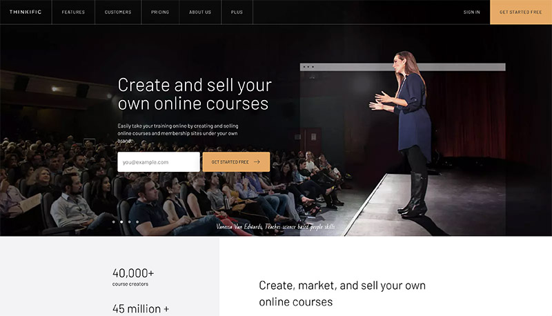 Thinkific обеспечивает превосходный опыт по сравнению с другими платформами для создания курсов по нескольким причинам. Прежде всего, конструктор курсов является одним из самых продвинутых на современном рынке. Если вы не очень разбираетесь в кодировании или не использовали код раньше, Thinkific – отличный выбор. Весь контент, необходимый для создания успешной “империи образования”, как называет ее компания, доступен через редактор, который можно перетаскивать. Вы можете добавить свой собственный брендинг, что очень удобно для создания собственного имени в Интернете. Для привлечения аудитории есть множество замечательных функций, таких как загрузки, викторины, опросы, обсуждения и многое другое. Кроме того, в отличие от многих конкурирующих платформ онлайн-курсов, решение Thinkific сначала доступно бесплатно.