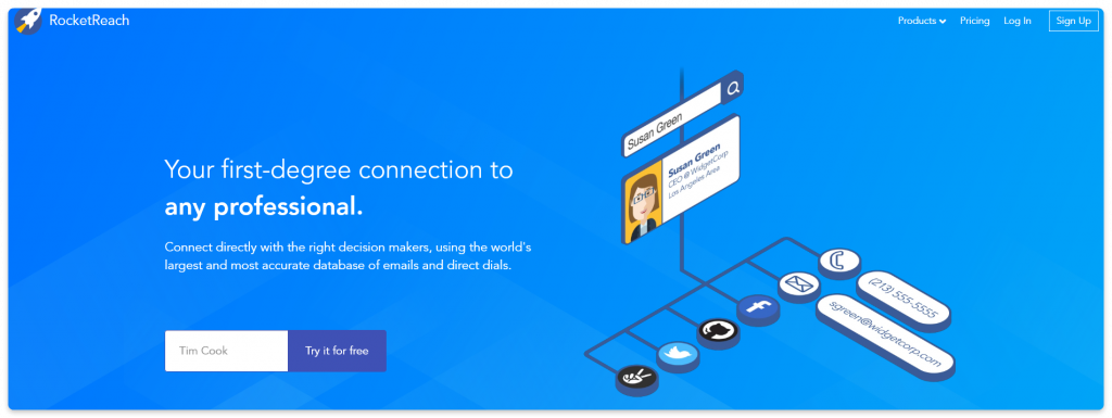 Rocketreach позволяет находить личные и рабочие адреса электронной почты, номера телефонов и аккаунты в социальных сетях из базы данных более 430 миллионов профессионалов из 17 миллионов компаний. Вы можете получить необходимую информацию с 50+ сайтов за один поиск.