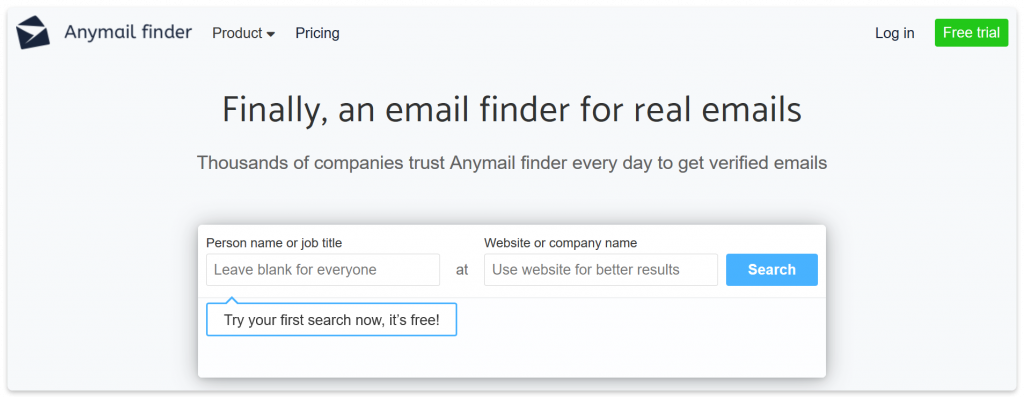 Anymail Finder – это инструмент для поиска и проверки электронной почты, который можно использовать как веб-сервис или API. С его помощью вы можете находить электронные письма по имени и домену потенциального клиента как по отдельности, так и оптом.