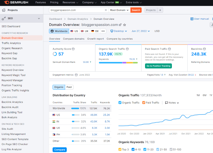 Semrush – это универсальный инструмент SEO, который поможет вам найти выгодные ключевые слова и сокрушить конкурентов, следя за их ключевыми словами, обратными ссылками, трафиком и рекламными стратегиями. Если вы хотите обогнать своих конкурентов, это единственный инструмент, который мы рекомендуем. Мы используем его уже более 6 лет и до сих пор очень довольны результатами. Semrush не только помог нам увеличить поисковый трафик нашего сайта, но и помог нам генерировать более $13 000 в месяц с блога, который вы сейчас читаете. Базы данных Semrush обновляются очень часто, и это единственная причина, по которой вы получаете точные данные. Если вы ищете ПРАВИЛЬНЫЙ инструмент между Moz и Semrush и ищете лучший инструмент, чтобы узнать, по каким ключевым словам ранжируются ваши конкуренты, а также их трафик, источники обратных ссылок и т.д., Semrush – идеальный инструмент для вас. Вот несколько основных преимуществ использования Semrush по сравнению с Moz Pro.