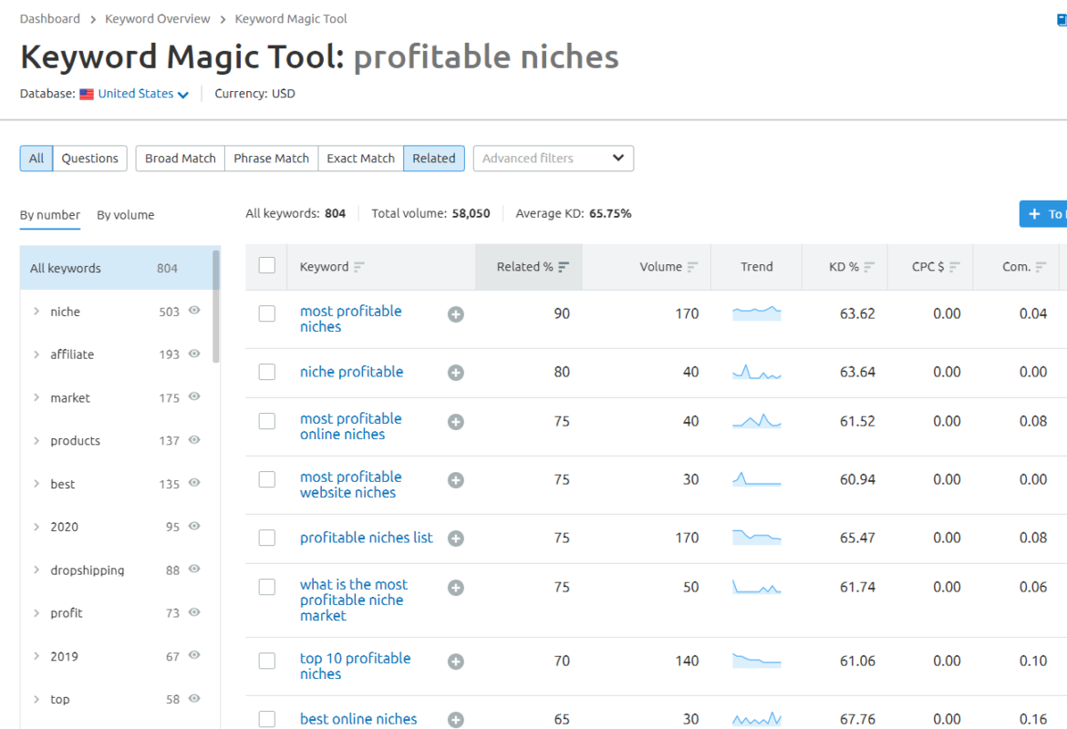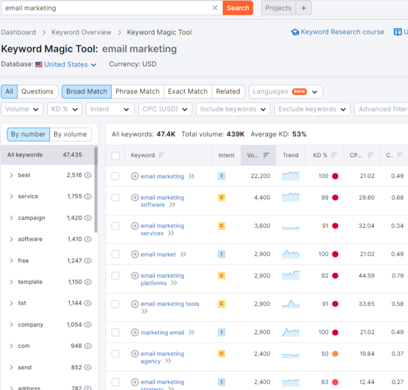 Вот как выглядит инструмент “Магия ключевых слов” на Semrush;