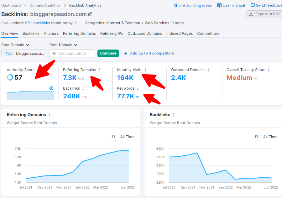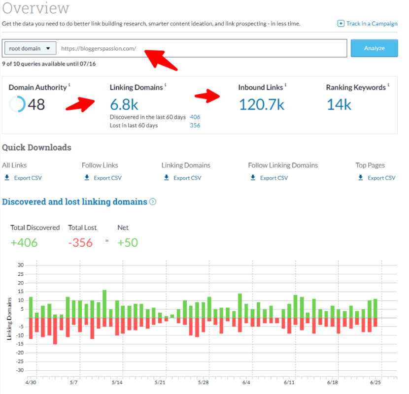 Как вы можете видеть выше, вы можете найти авторитетность домена, связывающие домены, входящие ссылки и многое другое.