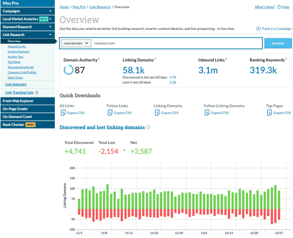 Инструмент исследования ссылок Moz также предлагает вам обширные данные, с помощью которых вы можете обнаружить ссылки любого сайта, а также новые и потерянные ссылки.