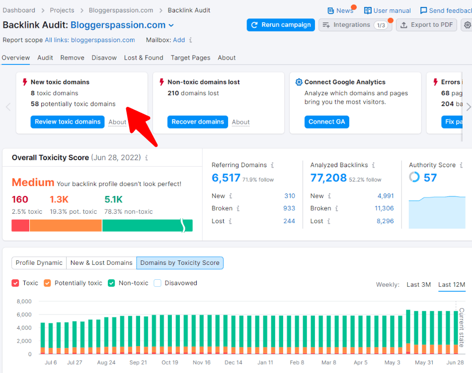 Как вы можете видеть выше, вы можете использовать их инструмент Backlink Audit для анализа профиля обратных ссылок вашего сайта. Вы можете легко обнаружить токсичные ссылки на своем сайте и дезавуировать их для повышения рейтинга.