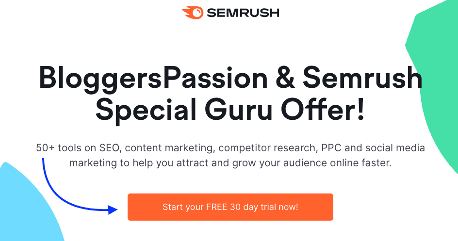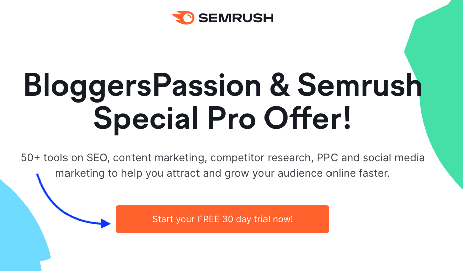 Шаг 1: Нажмите на эту специальную ссылку, чтобы бесплатно получить 30-дневную учетную запись Semrush (которая стоит $119,95, и вы получите ее бесплатно по ссылке). Как только вы нажмете на ссылку, вы попадете на нашу кобрендовую целевую страницу, которая выглядит следующим образом;