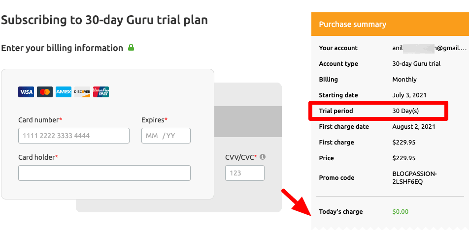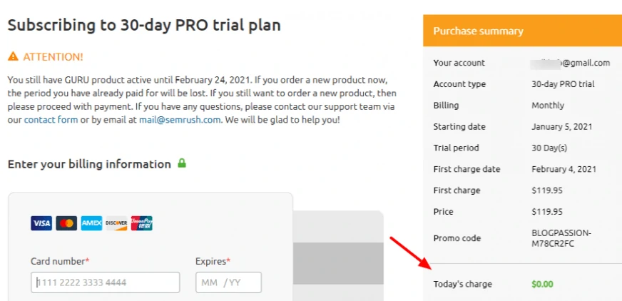 Шаг 3: Введите свои данные (электронную почту, пароль и платежные реквизиты), чтобы получить аккаунт Semrush Guru абсолютно бесплатно на следующие 30 дней.