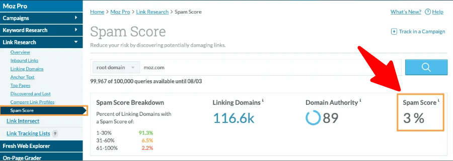 Анализ спама: Это еще одна недавно добавленная функция в инструмент Moz Pro. Оценка спама поможет вам найти потенциально спамные ссылки на ваших сайтах. Как только вы найдете и исправите эти ссылки, вы заметите, что ваш трафик увеличится. Вы также сможете избежать штрафов Google и провести тщательный аудит своего сайта на наличие вредоносных ссылок. Вот как выглядит показатель спама;