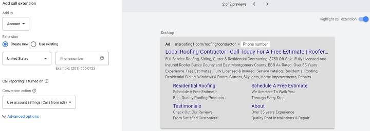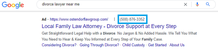 Это позволяет зрителям узнать ваш номер телефона без необходимости переходить на целевую страницу, поэтому люди смогут звонить непосредственно в ваш бизнес через это расширение рекламы Google.