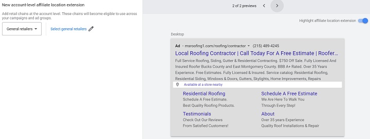 Для маркетинговых целей, связанных с несколькими локациями или франчайзингом, Google Ads создал расширение местоположения партнера. Это шаблонное расширение, которое позволяет вам выбрать из предварительно отобранного списка либо общих розничных торговцев, либо автодилеров по всему миру, которые вы можете прикрепить к своему объявлению. Когда зритель увидит ваше объявление, расширение affiliate location покажет местоположение ближайшей к нему розничной или автомобильной сети.