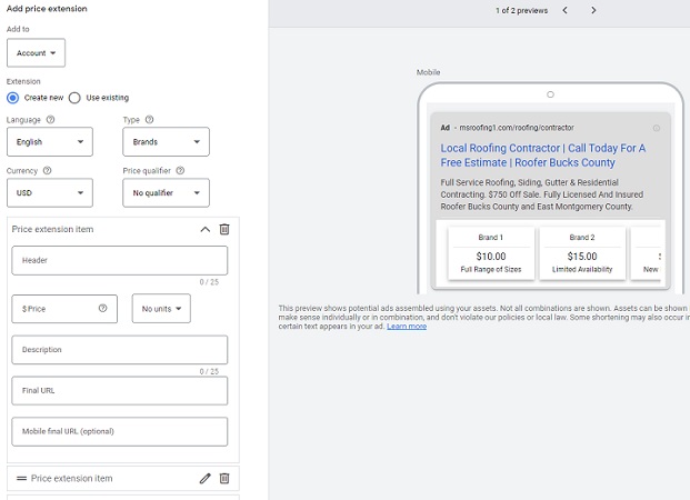 Расширения цен в Google Ads ориентированы на товары и предложения, поскольку позволяют перечислить конкретные товары с их ценами и описанием. Часть расширения имеет шаблонные варианты выбора от Google, например, тип продукта, валюту и любые ценовые параметры. Выбрав эти параметры, вы можете указать название товара, описание, цену и конечный URL. Вы можете добавить до восьми ценовых расширений в рамках одной сборки.