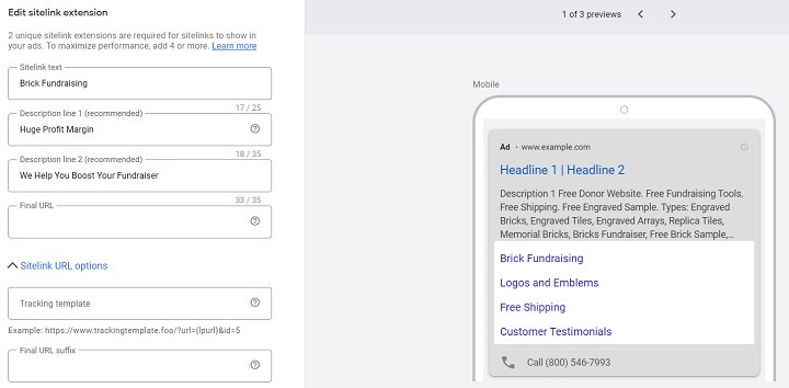 Чтобы избежать отклонения объявлений, убедитесь, что ваши сайтлинки указывают на те же домены, что и ваши объявления. Как и в случае с любыми другими объявлениями в Google Ads, вы также должны убедиться, что ваши расширения сайтлинков максимально заполнены контентом, богатым ключевыми словами.