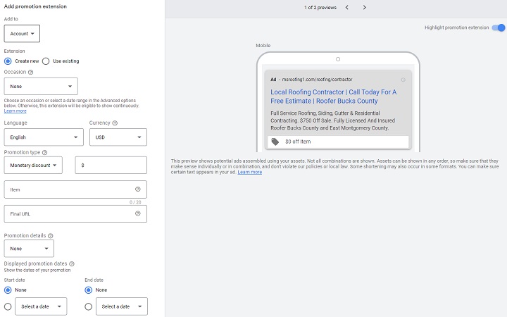 Расширения акции идеально подходят для ограниченных по времени предложений или скидок. Подобно ценовым расширениям, они позволяют выбрать из шаблонизированного списка тип акции, детали акции и валюту. Наконец, вы заполните описание продвигаемого товара, конечный URL-адрес и выберите дату начала и окончания акции или бессрочное расширение.