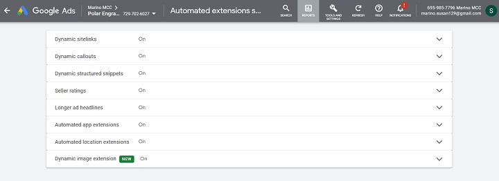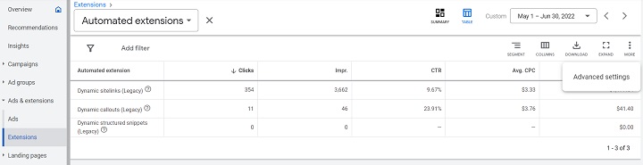Чтобы включить или выключить эти автоматические расширения Google Ad, вы должны нажать на “Автоматические расширения” в нижней части вашей начальной страницы расширений. Там вы увидите три точки в правом верхнем углу, чтобы перейти к “Расширенным настройкам”.