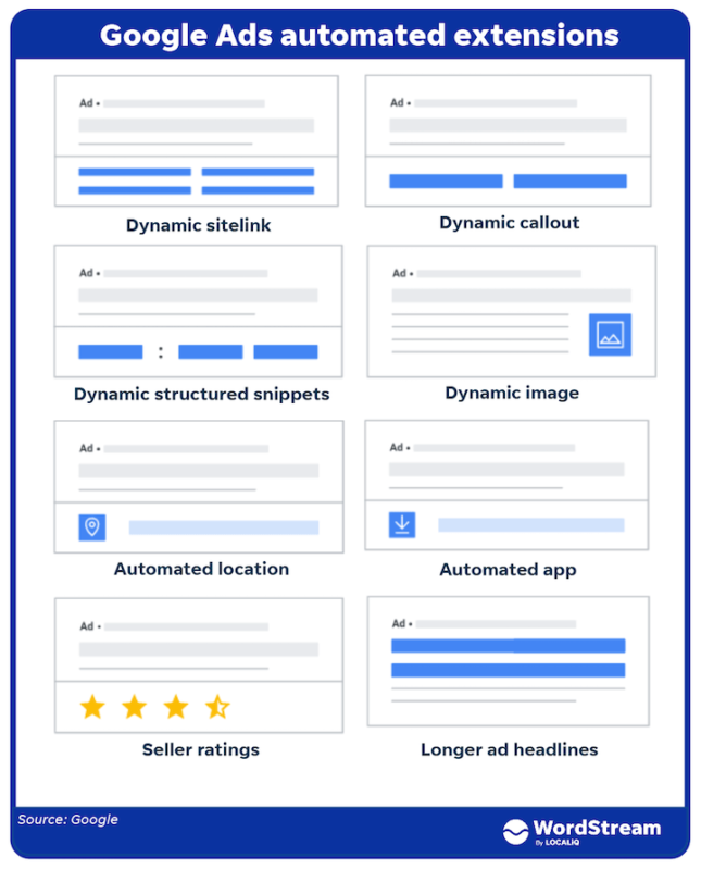 Всего в Google Ads доступно 19 расширений объявлений, восемь из которых являются динамическими, а остальные 11 настраиваются вручную. Мы разделили наш список таким образом, но нет правильного или неправильного ответа, когда дело доходит до выбора типа.