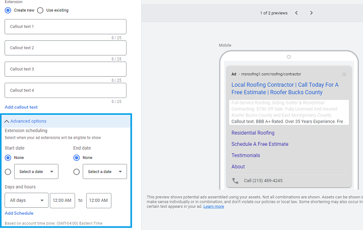 Хотя вы не можете контролировать, когда Google индивидуально решит показать определенное расширение, вы можете установить расписание для любого из ваших ручных расширений. Подобно планированию рекламы, вы можете решить, что выбранные расширения будут показываться только в определенные дни или время. Это можно сделать в разделе “Дополнительные настройки” на любом из экранов настройки расширений рекламы.